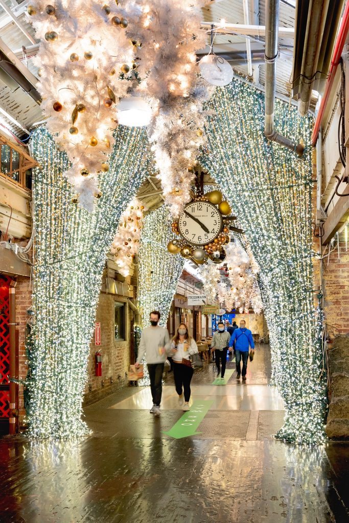 Spazieren Sie unter bunten Mylar-Fransen und Ornamenten, wenn Sie den Chelsea Market besuchen. Die Außenfassade des Marktes ist mit Lichtern geschmückt und im Inneren finden Sie dekorative Geschenke, beleuchtete Weihnachtsbäume und glänzende Ornamente.