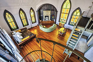 Esta antigua iglesia de tablillas, enclavada en 1,5 acres de bosque cerca de Woodstock, se ha transformado en un refugio espectacular y acogedor a la vez, donde las vidrieras góticas proyectan la luz del arco iris por todo el espacio.