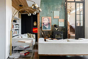 Lo que una vez fue un altar en funcionamiento es ahora un rincón acogedor en torno a una estufa de leña, enmarcada por una repisa rescatada de un histórico teatro de Broadway – un detalle que de alguna manera se siente perfectamente neoyorquino.