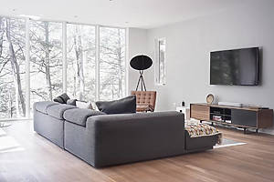 Las puertas correderas de cristal se abren a una terraza donde se puede escuchar el correr del arroyo y contemplar el bosque cambiar con las estaciones.