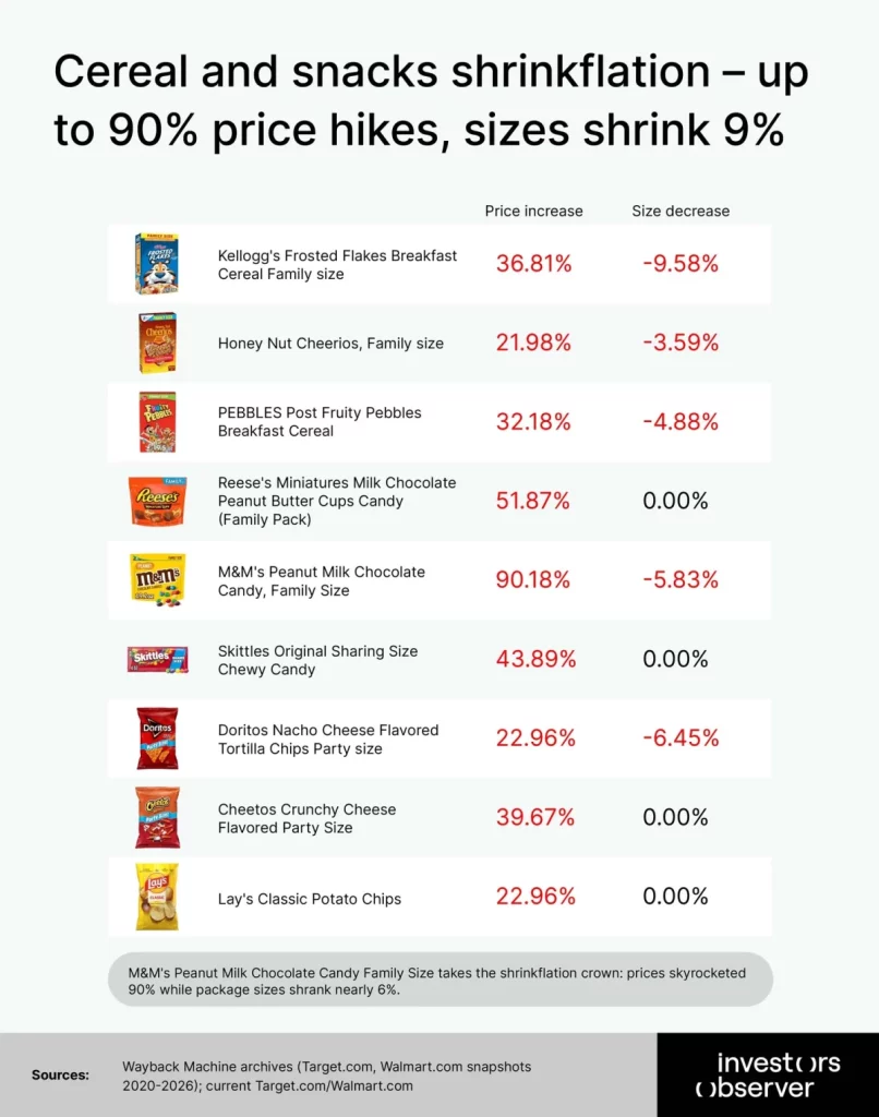 Un nuevo análisis de InvestorsObserver revela que, aunque muchos de los productos básicos más conocidos de Estados Unidos —como los Frosted Flakes, los Doritos, la Coca-Cola, la sopa Campbell’s y los M&M’s— pueden parecer iguales en las estanterías, en realidad te están costando mucho más.