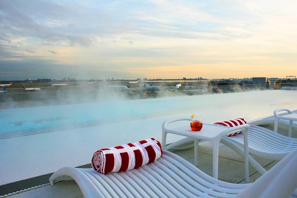 El TWA Hotel, recientemente nombrado el mejor hotel de aeropuerto de Norteamérica, cuenta con una emblemática piscina infinita en la azotea que permanece abierta los 365 días del año y que, durante los meses de invierno, se transforma en una gigantesca piscina-jacuzzi a 35 °C. Más información.