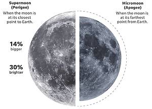 Superluna es el término más pegadizo para una Luna Llena perigeana, que es cuando la Luna Llena ocurre en o cerca de su punto más cercano a la Tierra en su órbita ovalada.