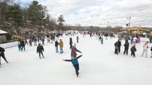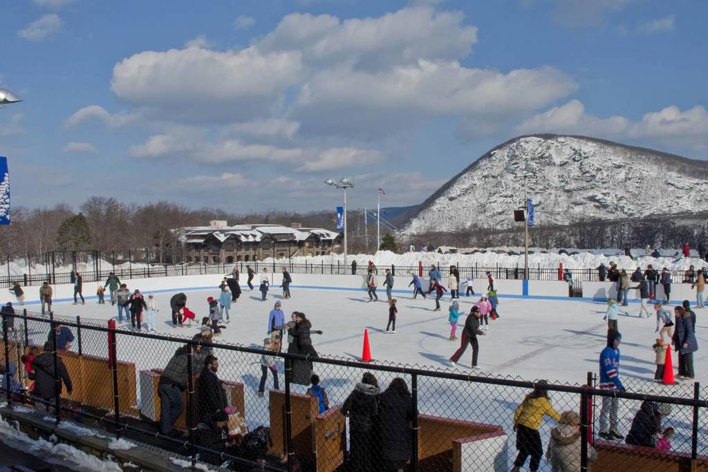 La patinoire extérieure de Bear Mountain est le clou de l’expérience hivernale. Entourée de pics escarpés et d’un ciel dégagé, elle est bien plus spectaculaire qu’une patinoire urbaine classique entourée de gratte-ciel.