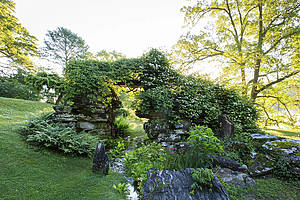 As you walk, scenes shift constantly: open lawns dissolve into shaded forest paths, rocky terraces step down toward the lake, and bog gardens feel almost otherworldly in their stillness.