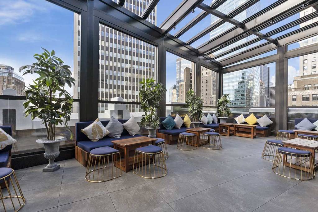 Il Magic Hour Rooftop al Moxy Times Square organizza una festa super energica per guardare la partita con otto grandi televisori, DJ dal vivo, drink speciali e vista completa sullo skyline.