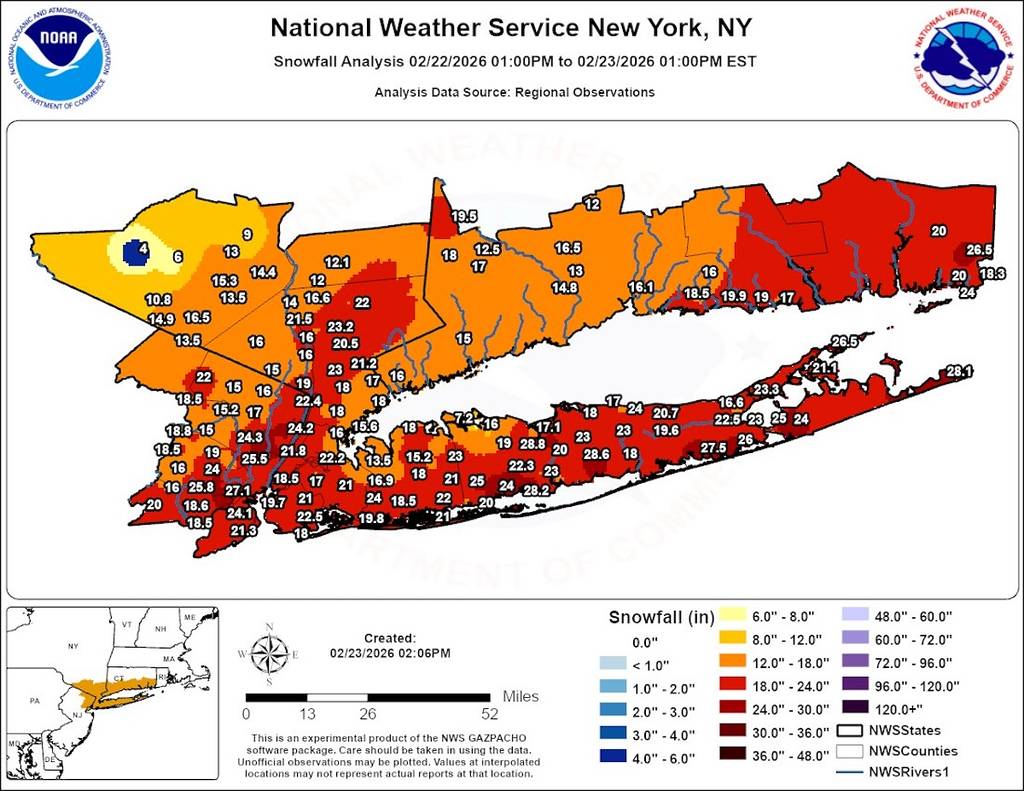 Às 13h de segunda-feira, a atualização das observações de queda de neve dos principais sites de reportagem informou que Islip registrou 29,1 polegadas de neve até o momento, marcando a nevasca mais prolífica em mais de 60 anos.