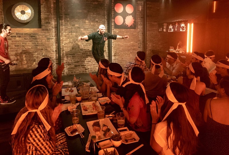 Peça um drinque, cumprimente seus vizinhos no espaço fechado – decorado com cortinas de veludo vermelho, tapetes persas e obras de arte peculiares – e desfrute de alguns truques de prestidigitação que o deixarão com a cabeça coçando.