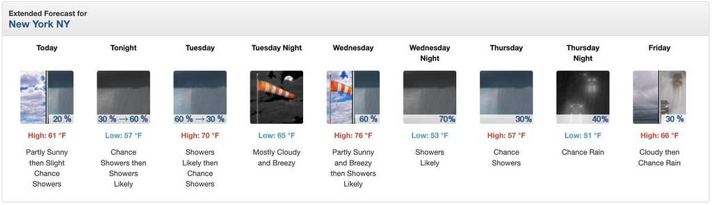 A AccuWeather prevê ventos moderados e uma possível tempestade à tarde, enquanto o Serviço Nacional de Meteorologia também prevê chuvas e possíveis tempestades se formando após as 17h.
