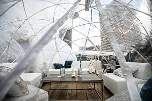 Os menores Cozy Winter Igloos são lounges com cúpula aquecida, com assentos confortáveis e vistas transparentes da vila – perfeitos para encontros de seis pessoas, encontros de férias ou um momento particular de après.