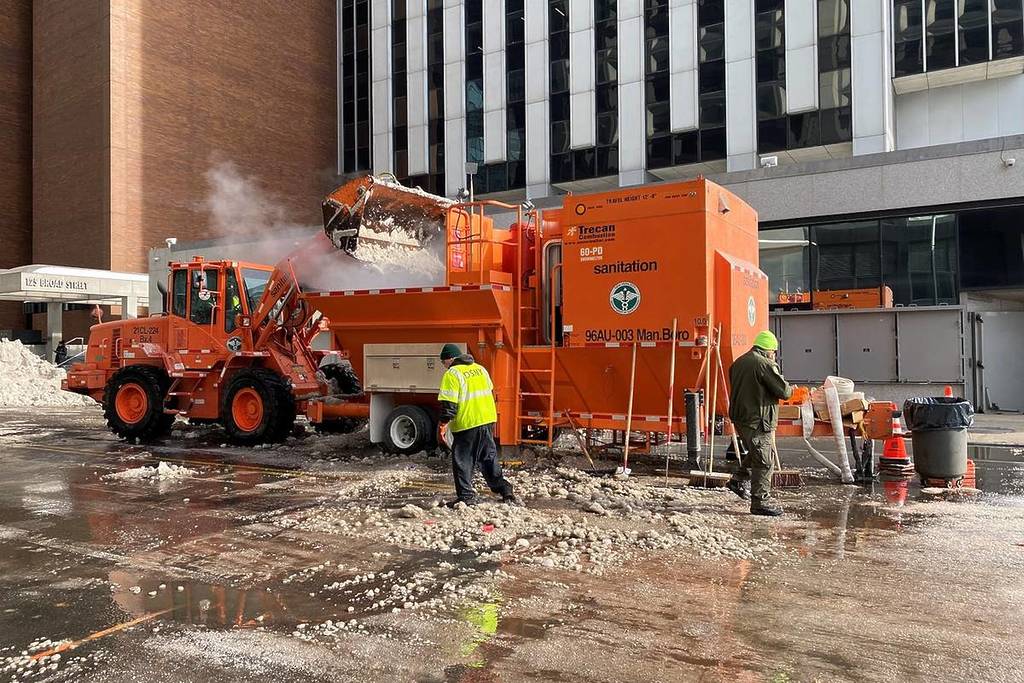 Sanitation crews are working around the clock in 12-hour shifts to keep the machines fed, while hundreds of additional workers focus on clearing sidewalks, bus stops, and intersections.