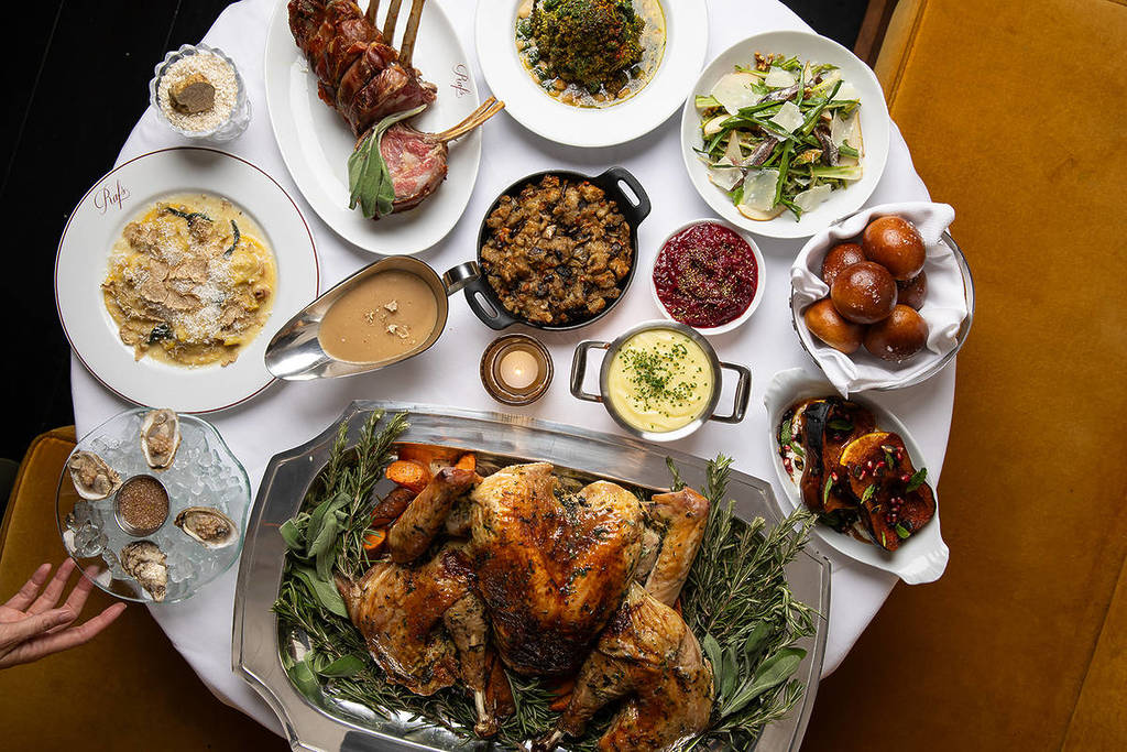 Expect housemade breads, oysters, chestnut ravioli, and a choice of wood-oven heritage turkey or porchetta — plus refined seasonal sides.