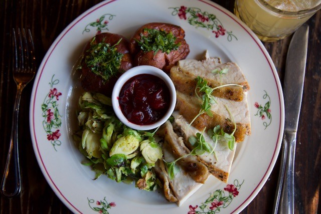 Each plate ($56) features turkey breast and thigh with sausage stuffing, roasted squash or sweet potato, cranberry mostarda, and rosemary gravy — with each restaurant putting its own flavorful spin on the tradition.